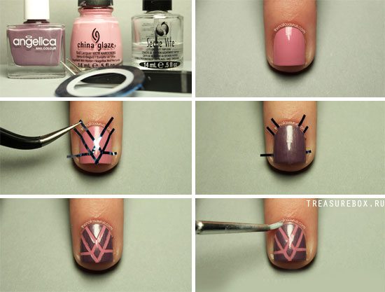 Выполнить самостоятельно маникюр со скотчем очень просто. Формировать рисунок лучше всего поэтапно.