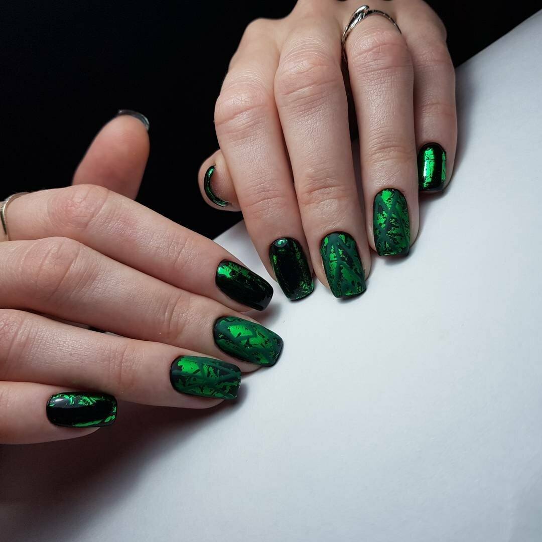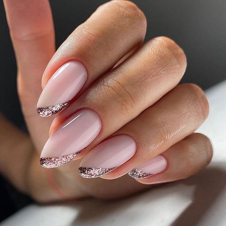 Прекрасный вариант для праздничного дизайна. Кончик ногтя можно заполнить плотными блестками или использовать мелкие частички специальной маникюрной пудры. Втирать их можно аппликатором для теней или пальцем.