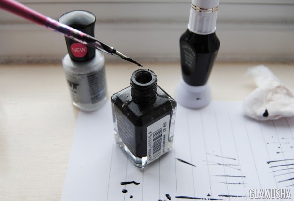 - Взять один цветной гель лак и промокнуть кисть в небольшом клочке бумаги, чтобы на ней не оставалось много лака.