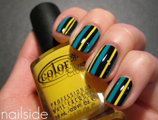 Используйте эти три цвета для рисования полос на поверхности ногтя. Они должны быть примерно одинаковой ширины. Вам нужно нарезать аккуратные тонкие лучи из специально окрашенного скотча. Прикрепите их к поверхности ногтя и покройте прозрачной основой. Они выглядят очень стильно.