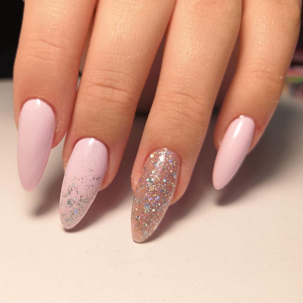 Не забывай про синий маникюр с дизайном в виде россыпи блесток у основания ногтевой пластины. Самый же модный маникюр в этой технике – молочный градиент с заливкой блесток или пайеток.