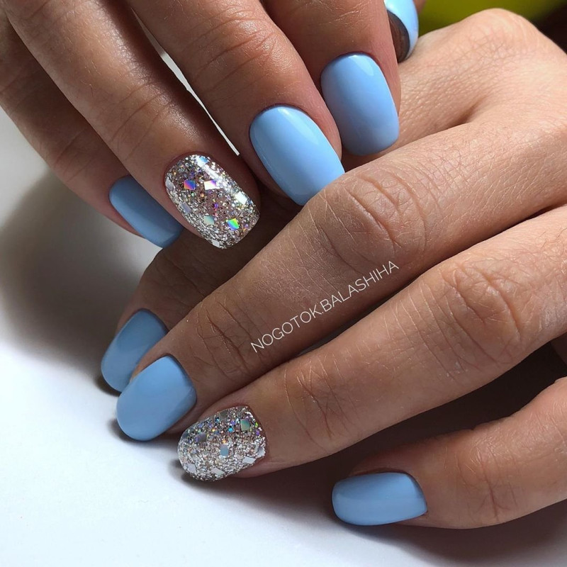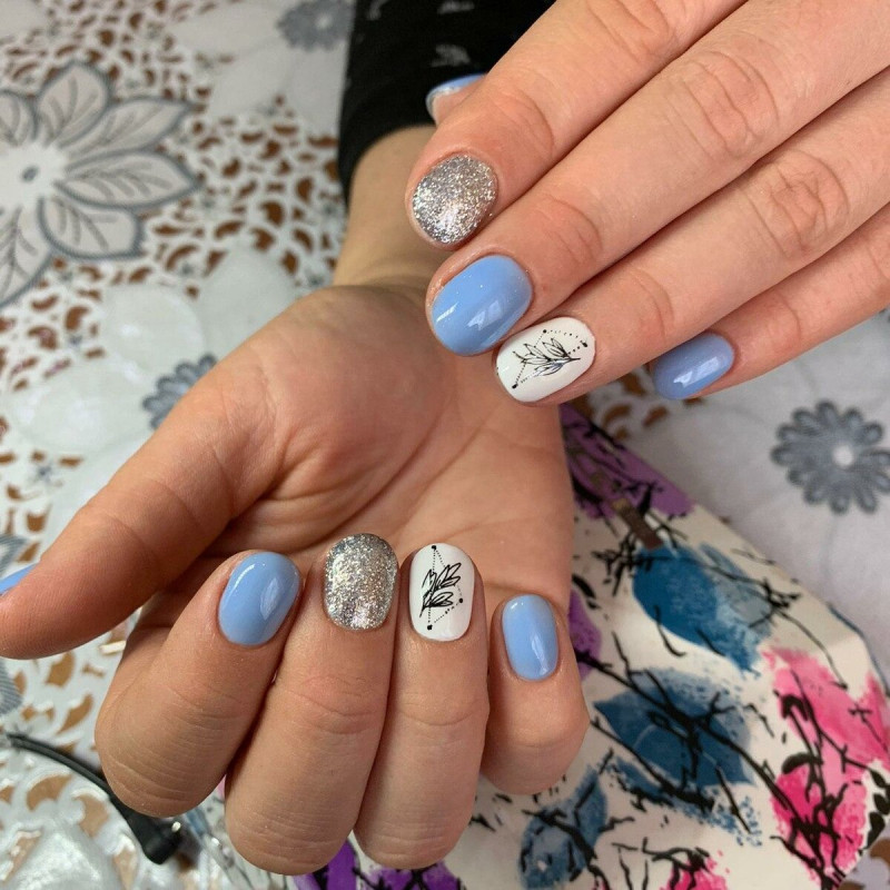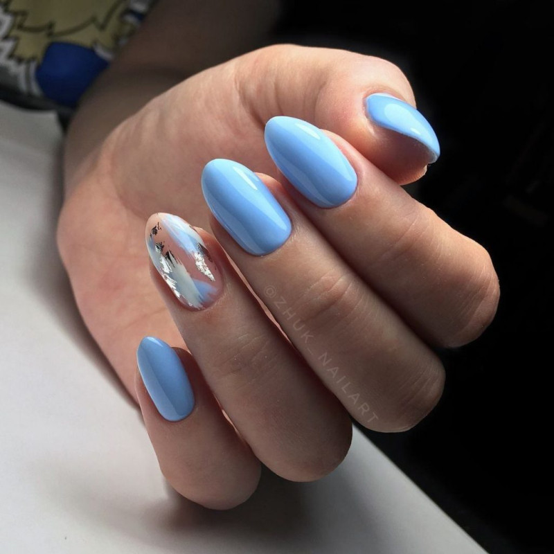 Голубой с серебром могут комбинироваться в разных типах дизайна – от небольших полосок и орнамента до полного покрытия ноготков с чередованием. Серебро лучше применять в качестве акцентного цвета на небесном фоне. Голубой с золотом точно не оставят женщину незамеченной: этот дуэт относится к трендам сезона и может выполняться с помощью фольги, блёсток, глиттера, шеллака.