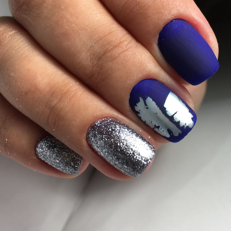 Матовый синий маникюр с дизайном втиркой. Полюбившаяся мастерам зеркальная втирка в оттенках золото, серебро или радуга позволяет преобразить фоновый цвет и сделать дизайн нарядным. Для создания эффекта кошачий глаз можно использовать магнитную втирку.