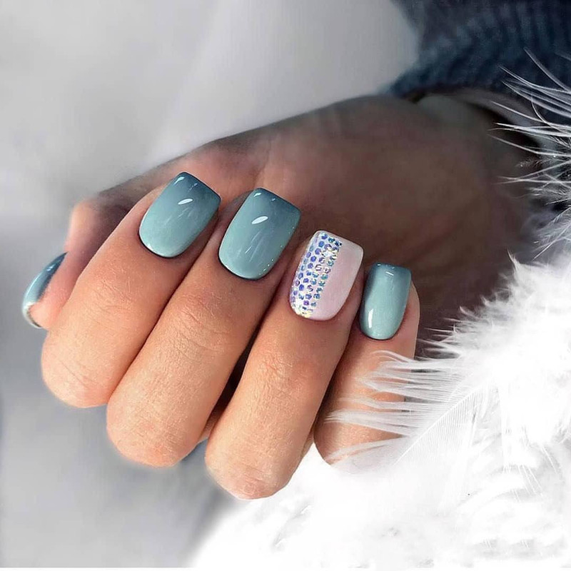 Серо-голубые ногти – благородное и элегантное сочетание тонов, которое идеально подходит для рабочих будней. Разнообразить его поможет техника градиент, минималистичные белые или черные рисунки, стразы и блёстки.