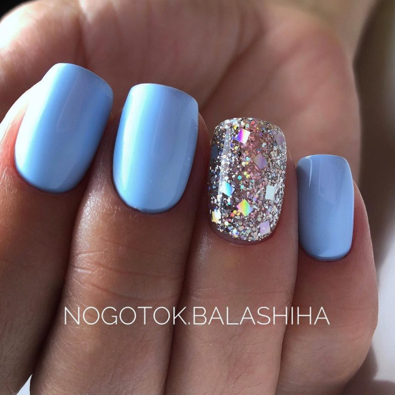 - акцентный ноготь: покрасьте все ногти в один оттенок синего, а на одном из них создайте акцентный дизайн. Например, вы можете добавить блестки, полосы или абстрактные узоры;