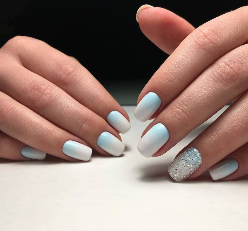 Белый и небесный прекрасно сочетаются в технике градиент, омбре. Для праздничного маникюра можно дополнительно украсить ноготки стразами.