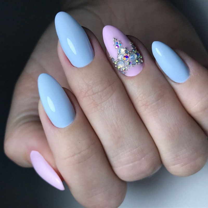 Светло-голубые акриловые ногти хорошо смотрятся в вечерних образах. Такой маникюр подходит для неординарных девушек, которые любят сочетать несочетаемое. В нем есть все: и глянцевое покрытие, и геометрические узоры, и глиттер со стразами.