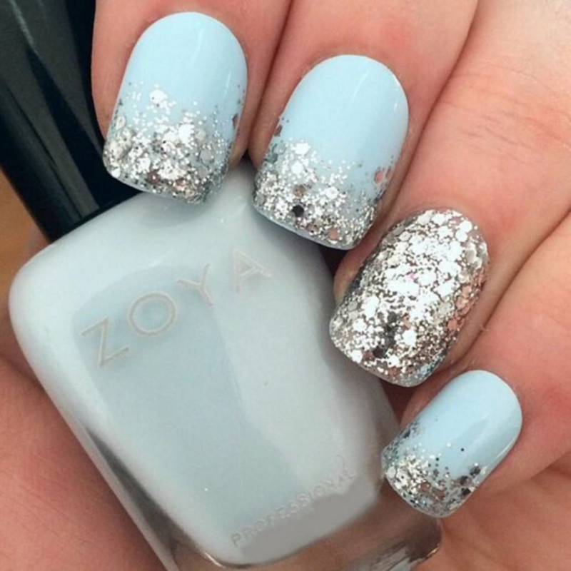 Не забывай про синий маникюр с дизайном в виде россыпи блесток у основания ногтевой пластины. Самый же модный маникюр в этой технике — молочный градиент с заливкой блесток или пайеток.