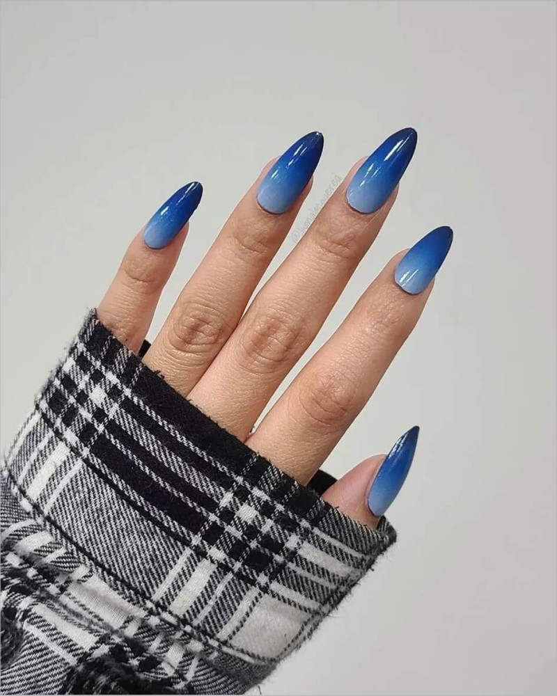 синий омбре: сделайте омбре-маникюр, переходящий от светлого к темному синему оттенку от основания ногтя к кончику;