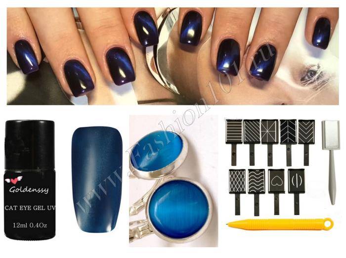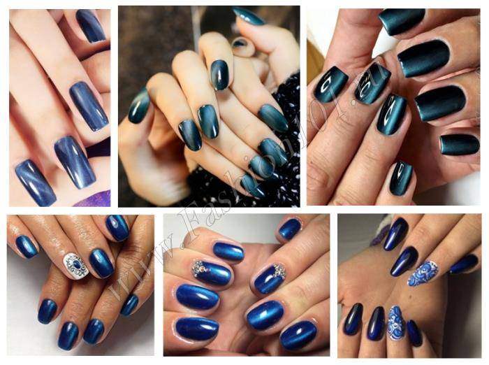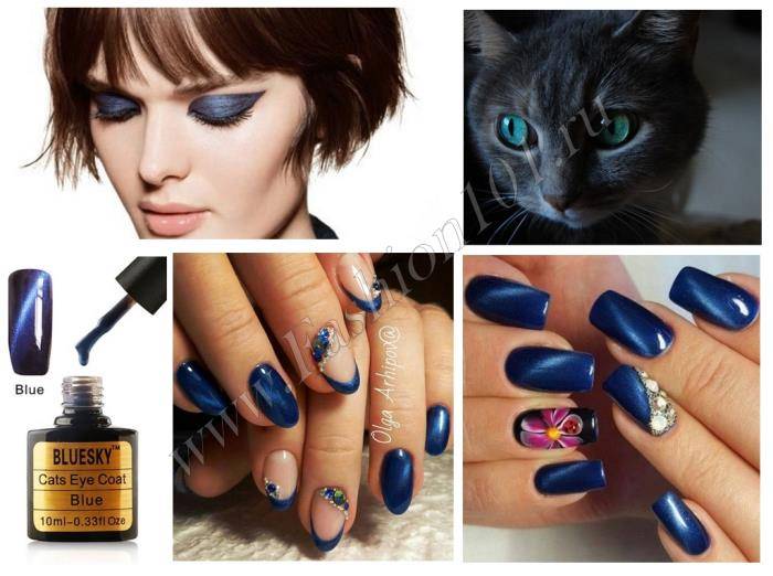 Специальный лак «кошачий глаз» можно наносить на синюю основу. Этот цвет довольно густой и эффект от лака будет очевиден. Завершить такой маникюр лучше глянцевым финишем.