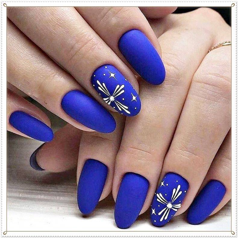 матовый синий маникюр: примените матовый топ-покрытие к синему маникюру для создания матового эффекта. Матовые оттенки смотрятся особенно стильно на длинных ногтях.