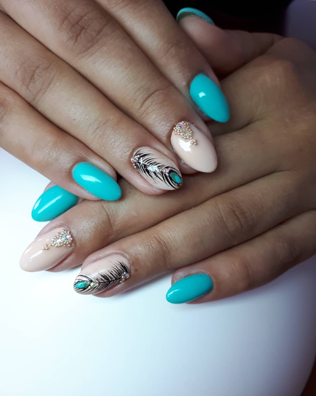 Нежная подложка эффектно подчеркивает изящество ногтей формы «балерина». А яркий узор в виде синих перьев, дополненный декором, добавляет маникюру оригинальности. С таким украшением классическое покрытие уже не выглядит скучным! Необычный дизайн хорошо смотрится не только на длинных ногтях. Для него подойдут и короткие ногти.