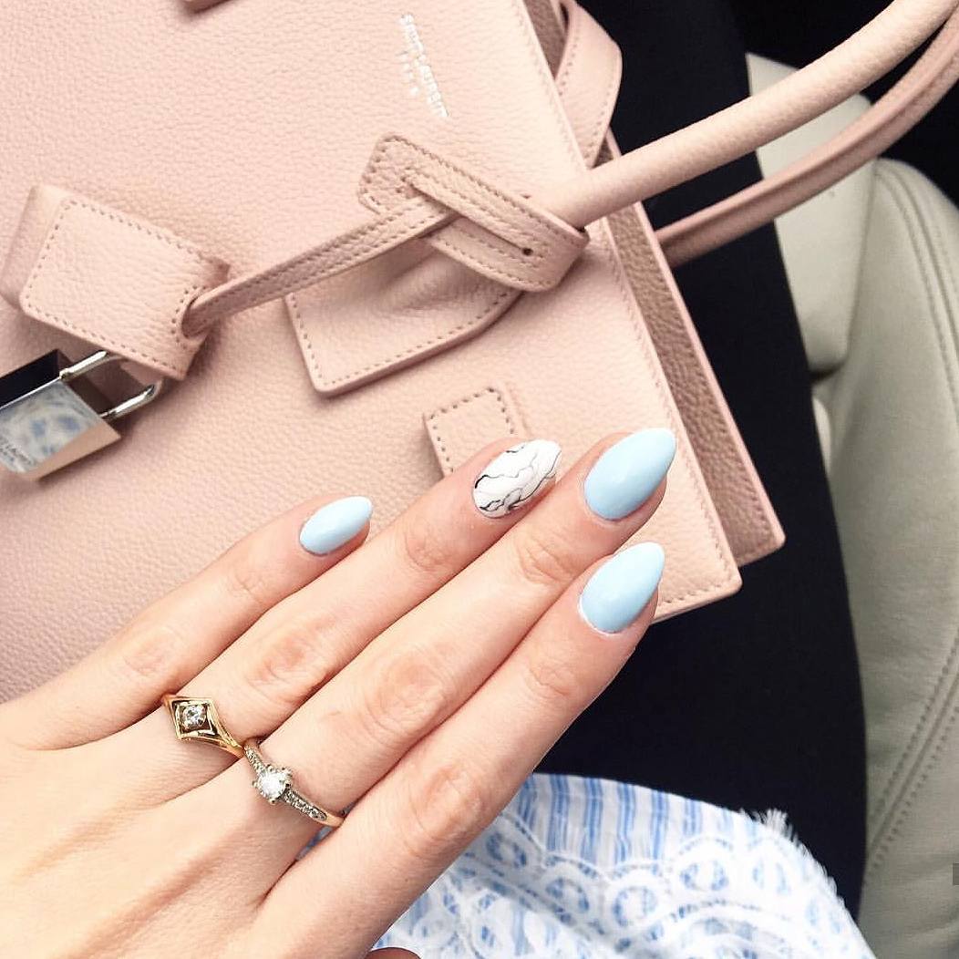 Нежно-голубой маникюр идеально подходит к романтическому образу женщины. Чем светлее выбранный тон лака, тем моложе выглядит его обладательница. Ногти небесного цвета – прекрасное решение для офиса, где не приветствуются яркие варианты дизайна.