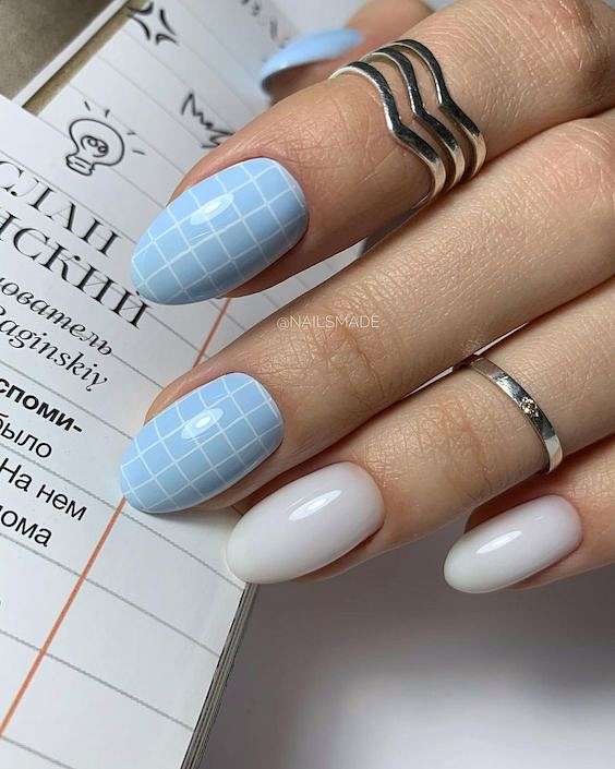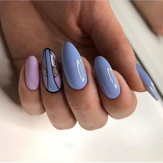- геометрический дизайн: создайте геометрические узоры, используя синий цвет. Вы можете нарисовать треугольники, полосы или ромбы, чтобы добавить ногтям современный и модный вид.