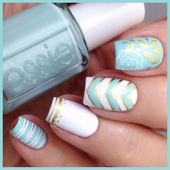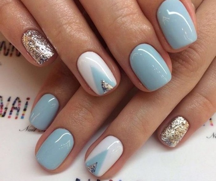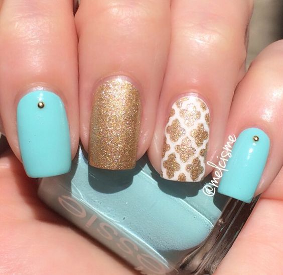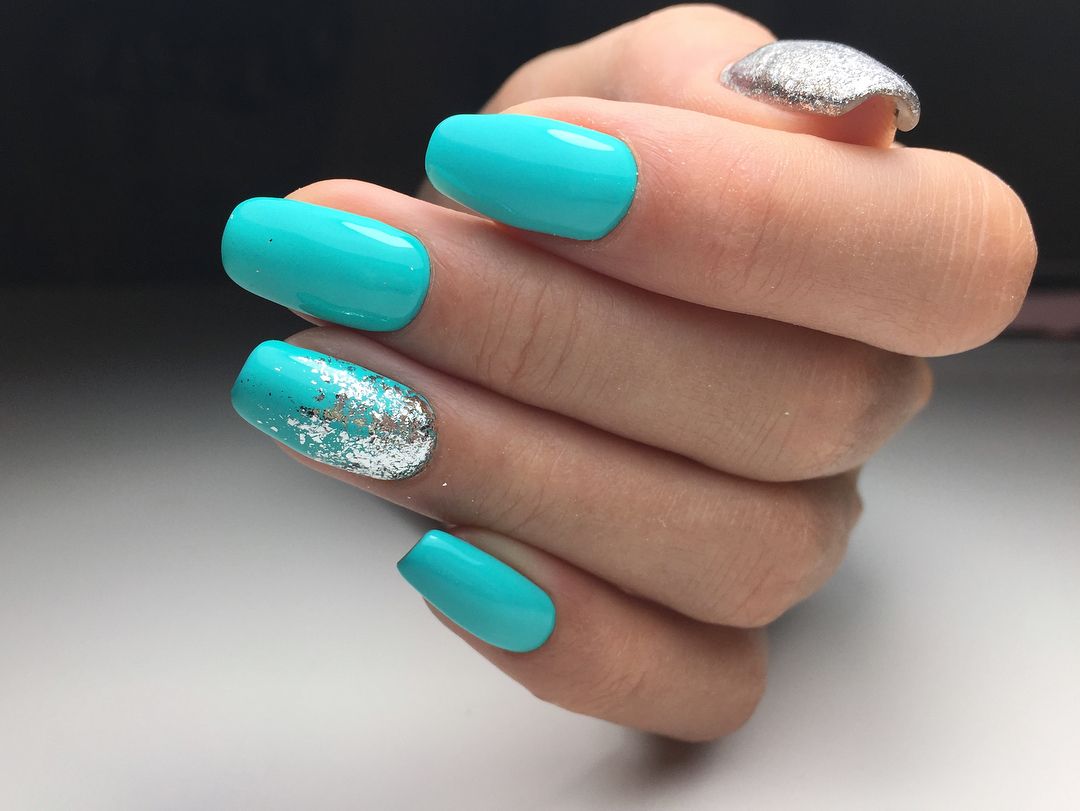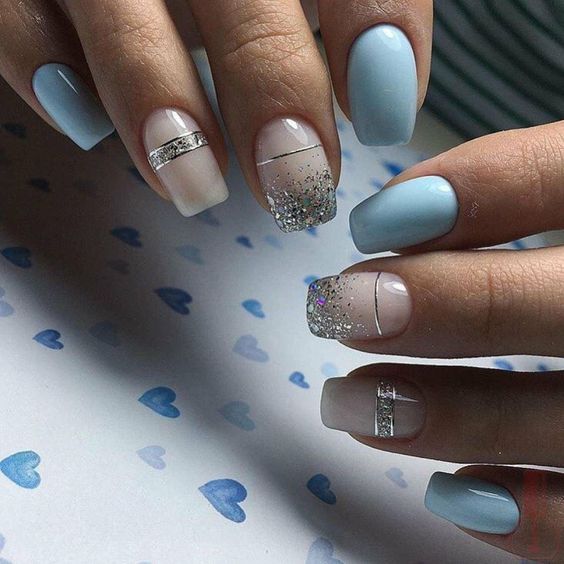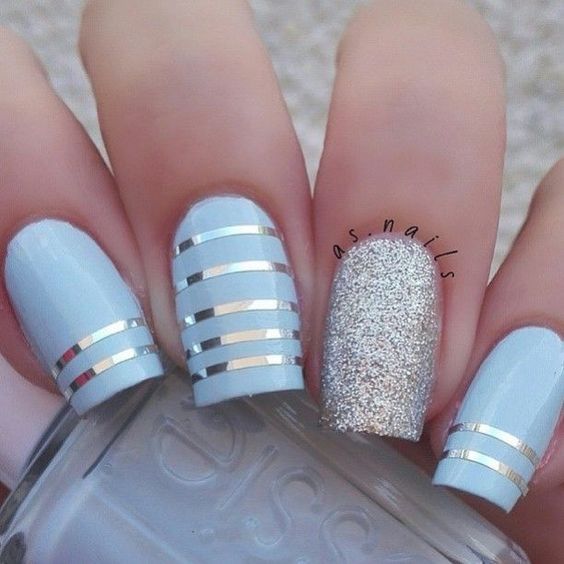 Голубой с серебром могут комбинироваться в разных типах дизайна – от небольших полосок и орнамента до полного покрытия ноготков с чередованием. Серебро лучше применять в качестве акцентного цвета на небесном фоне. Голубой с золотом точно не оставят женщину незамеченной: этот дуэт относится к трендам сезона и может выполняться с помощью фольги, блёсток, глиттера, шеллака.