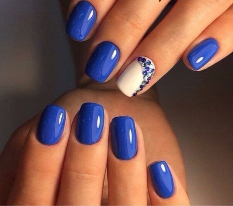 Синий изумительно подходит на квадратную форму ногтей. Придав им форму, слегка подпилите острые края и отполируйте поверхность ногтевой пластины.