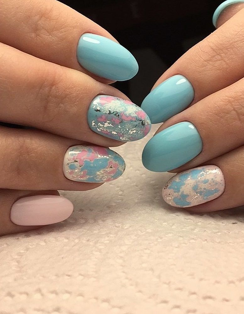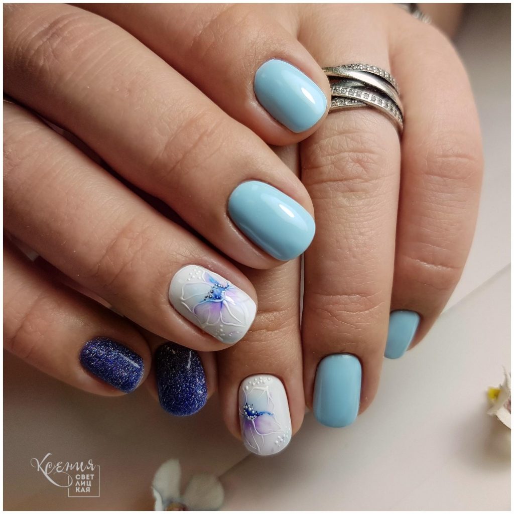 Маникюр голубого цвета с разными оттенками гель-лаков