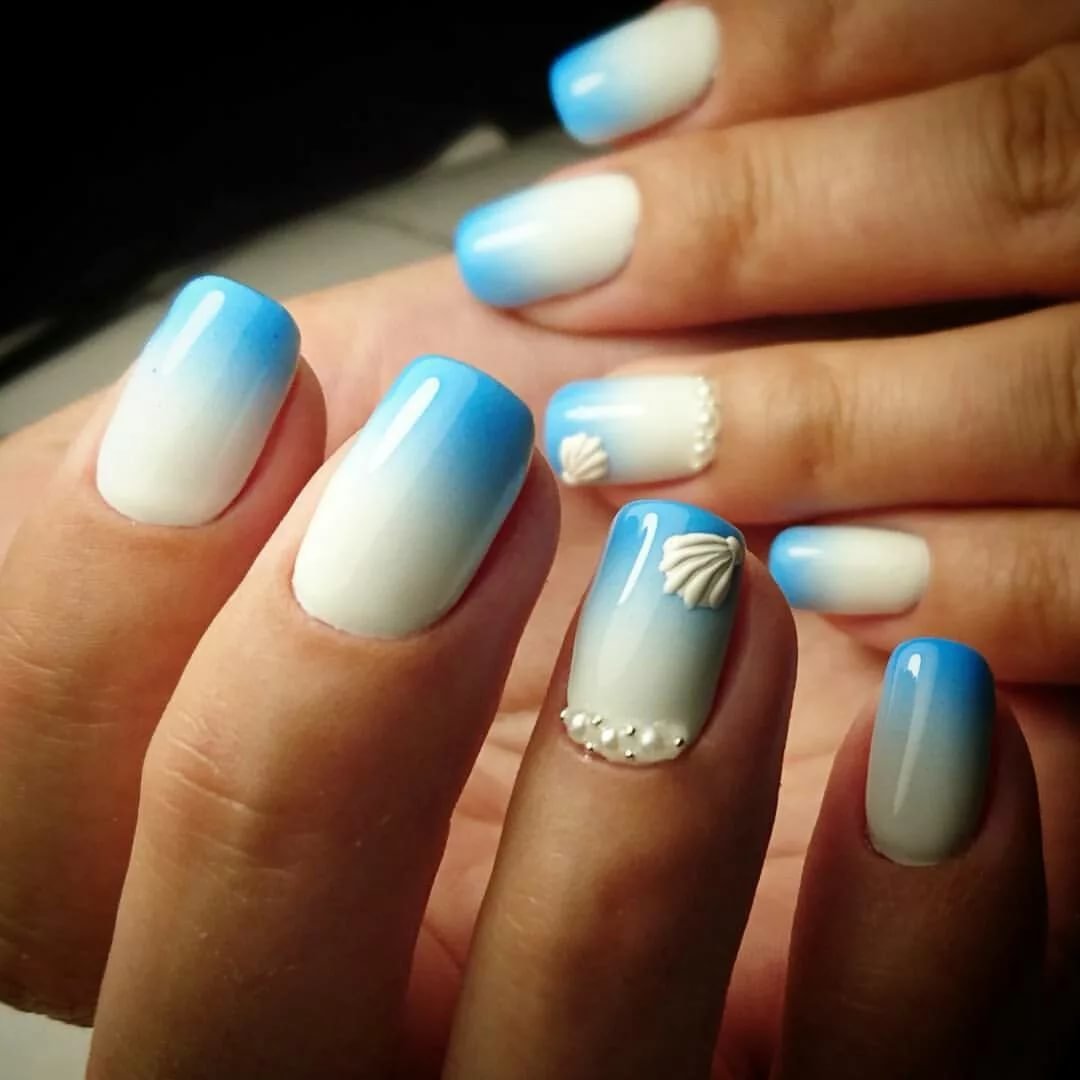 - омбре маникюр: попробуйте создать плавный градиент от светлого синего к темному на каждом ногтевом ложе. Это добавит интересный акцент и придаст вашим ногтям стильный вид;