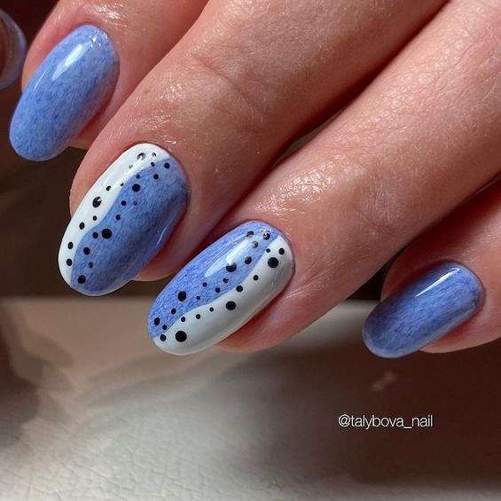 Популярный синий маникюр 2021 — оформление с разводами. Чтобы создать такой нейл-дизайн на палитре поставь 2-3 капли разных оттенков синего и аккуратно смешай между собой, чтобы получили разводы. Затем набирай понемногу и переноси на ноготь. Кстати, лучше всего переносить узор на непросушенный топ – линии будут лучше растекаться и в итоге дадут красивый рисунок.