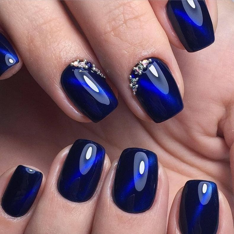 Темно-синий маникюр с легкими бликами блесток придает всему образу четкости, выразительности завершенности. Такой оттенок подойдет к любому наряду, так как может стать альтернативой черному. Декор из стразов создаст праздничное настроение. Можно сделать его минимальным, украсив камнями только один ноготь, или декорировать два средних пальца, сделав маникюр по фен-шуй.
