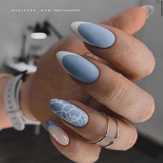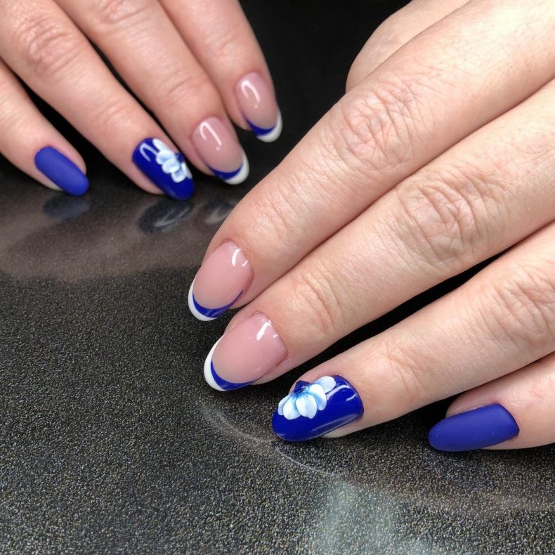 - французский маникюр: вы можете сделать классический французский маникюр, используя синий цвет вместо обычного белого. Это выглядит элегантно и подходит для любого случая;