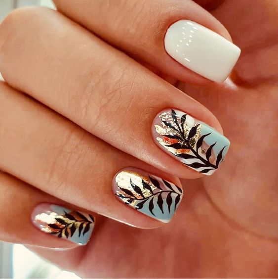 Немного разнообразить синий матовый маникюр на коротких ногтях поможет дизайн — это может быть растительный принт или даже анимализм.