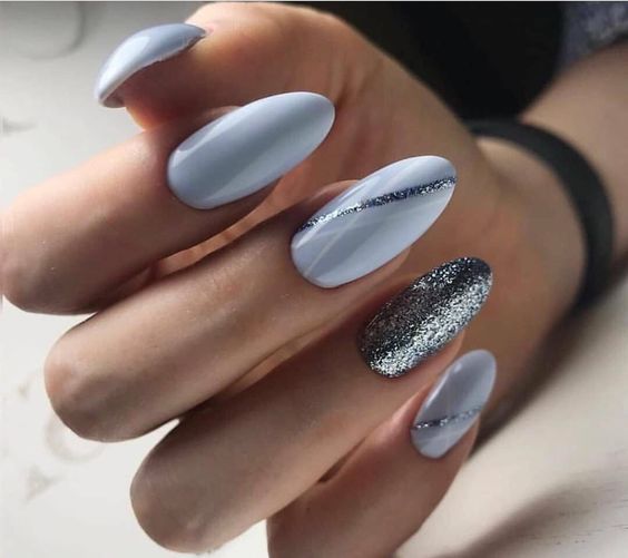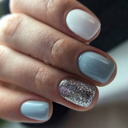 Серо-голубые ногти – благородное и элегантное сочетание тонов, которое идеально подходит для рабочих будней. Разнообразить его поможет техника градиент, минималистичные белые или черные рисунки, стразы и блёстки.