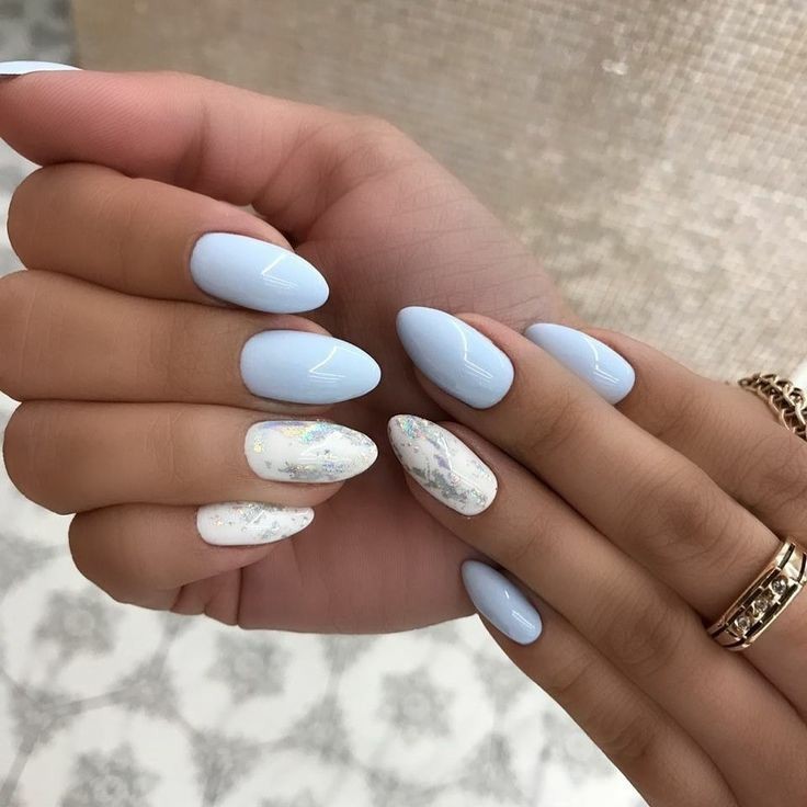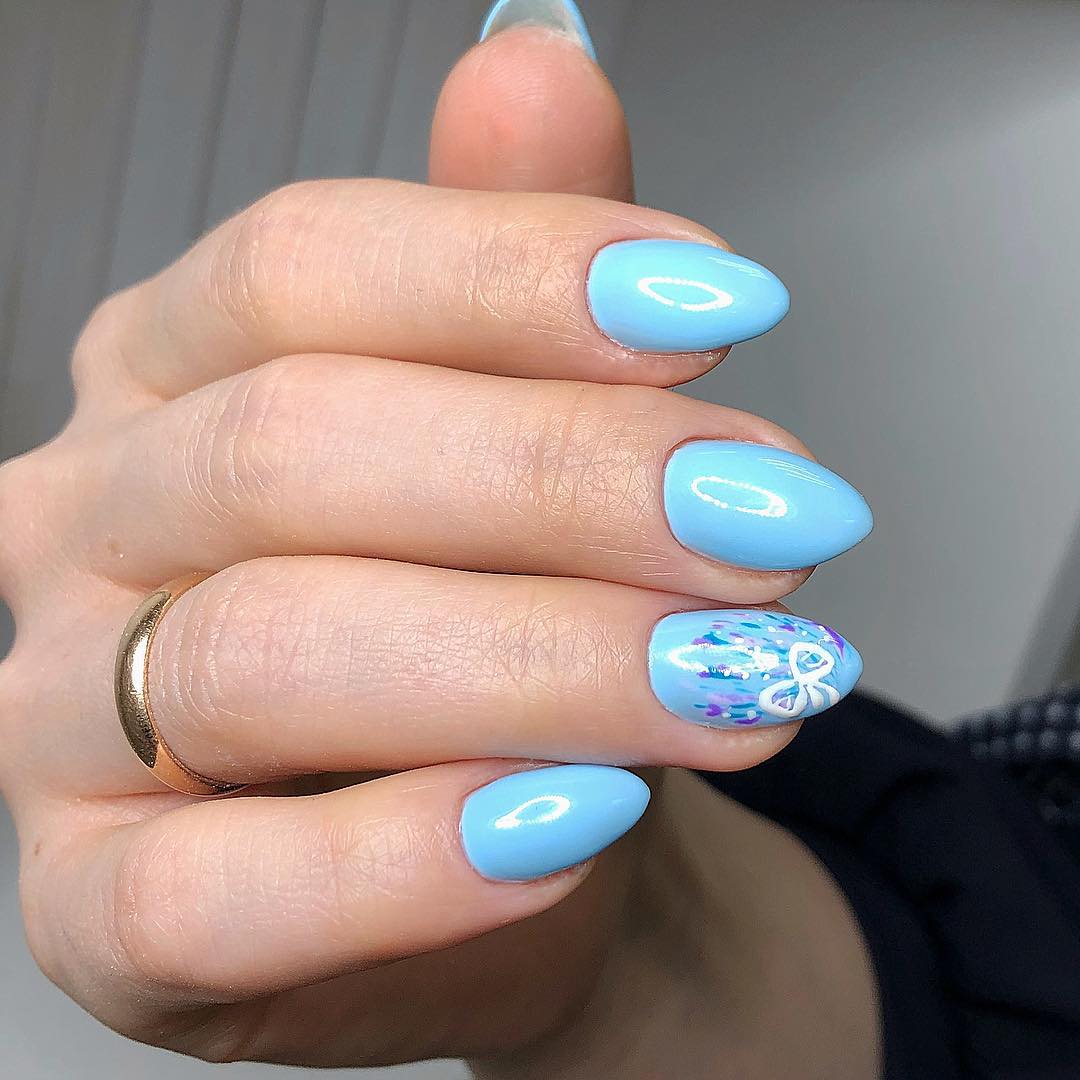 Классическим вариантом оформления ногтей миндальной формы является однотонное покрытие. Миндальные ногти отлично раскрывают весь потенциал синего цвета. На ногтях такой формы он смотрится особенно выразительно. Сразу становится видна вся глубина оттенка. Если хочется разбавить дизайн, сверху можно нанести немного блесток.