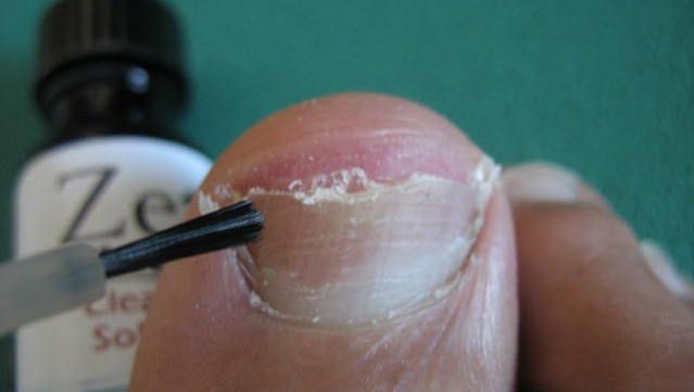- Необходимое количество лака нанести при помощи аппликатора на пораженные ногти.