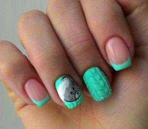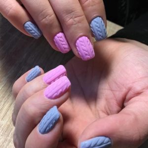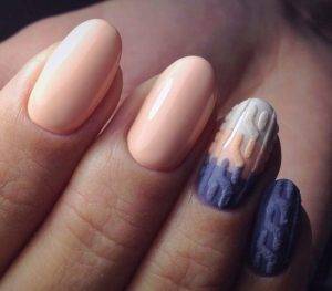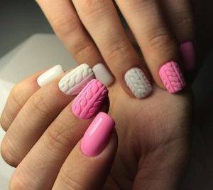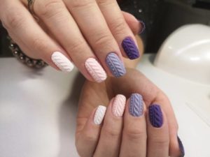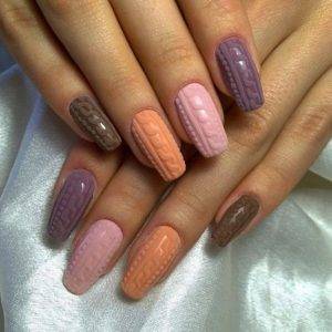 Одним из весьма популярных видов исполнения вязаного маникюра является использование нескольких близких оттенков в одном маникюре. К примеру, можно использовать розовый, персиковый, голубой, бежевый, бирюзовый гель лаки на отдельных ноготках, выполнив на них забавные узоры.