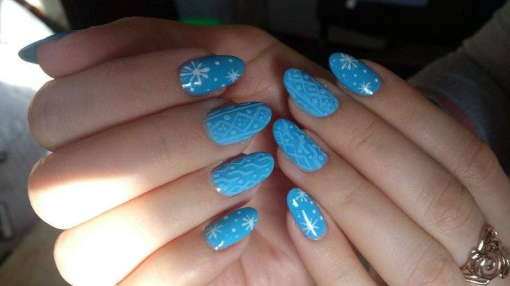 Красивый морозный маникюр со снежинками и вязаным шарфиком на безымянных пальчиках