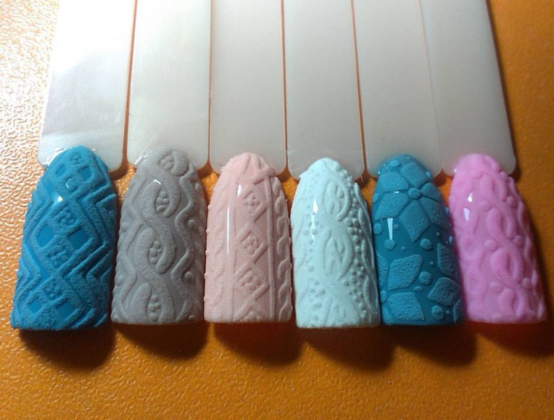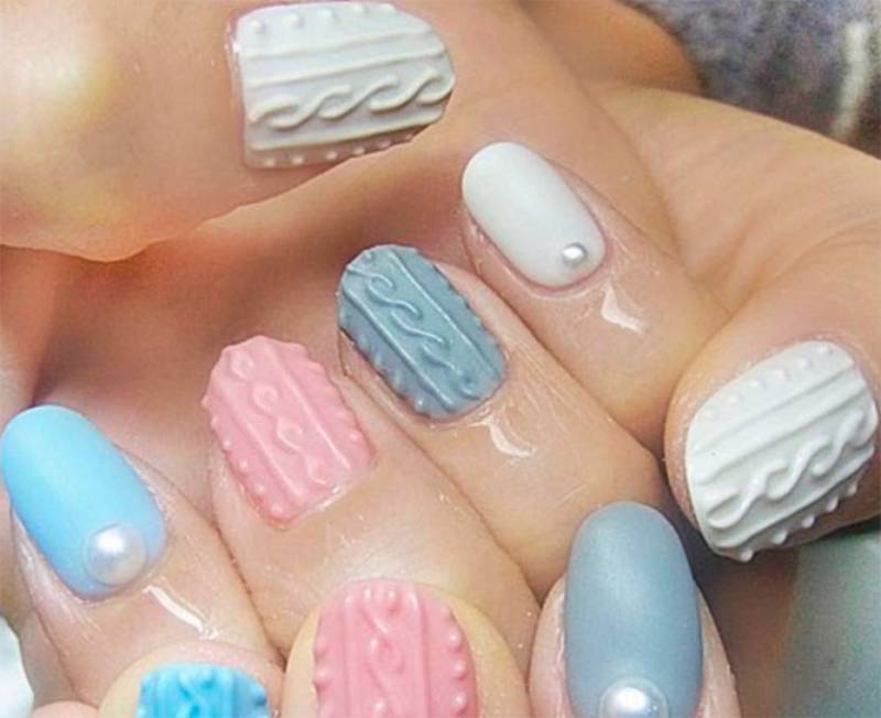 Главная особенность вязаного маникюра – его объемность, идеальная копия петелек в любимом шарфе или шапочке.
