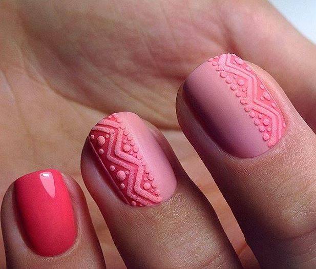 - Объемный дизайн цветным гель-лаком на таком же или контрастном фоне. Подойдет на каждый день для осенне-зимнего сезона. Более практичный в сравнении с пудровой текстурой, так как не цепляется за волосы и одежду.