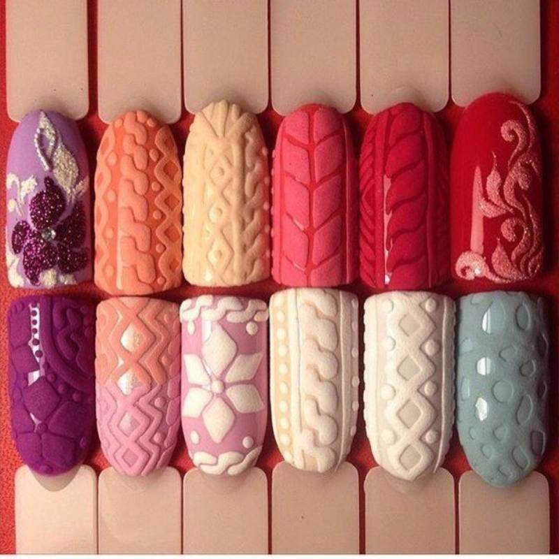 - Бархатный узор. После нанесения цветного покрытия, наносим глянцевый топ и сушим в лампе. Затем рисуем вязаный узор с помощью тонкой кисточки. И щедро посыпаем ноготок бархатным песком или акриловой пудрой. Сушим в лампе. Пушистой большой кисточкой или щеточкой стряхиваем лишнюю пудру. В итоге получится мягкий изогнутый вязаный узор, а основа ногтя при этом будет гладкой и глянцевой. Если вы хотите, чтобы основа ногтя была матовой — используйте матовый топ или зашлифуйте мягкой пилочкой (бафиком) поверхность глянцевого топа после сушки, он станет матовым.
