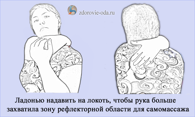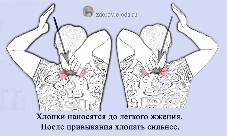 Кожные покровы, области 6-7 позвонка и предплечья, сжать в ладони ненадолго, а затем отпустить и повторить с другой стороны. Если получается, движения совершать обеими руками одновременно, замечательно.