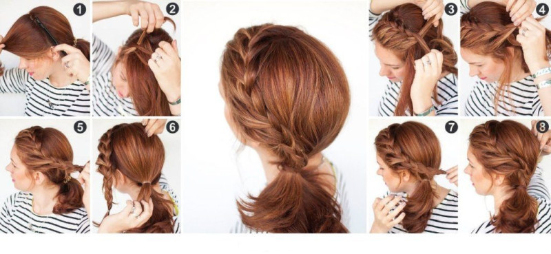 Если классическая техника плетения французских кос оказалась вам не под силу, то не нужно отчаиваться. Сделать шикарную косу вам помогут обычные резиночки. Такую косу можно украсить яркой заколкой или необычной резинкой. Подобные прически пошагово представлены на фото ниже.