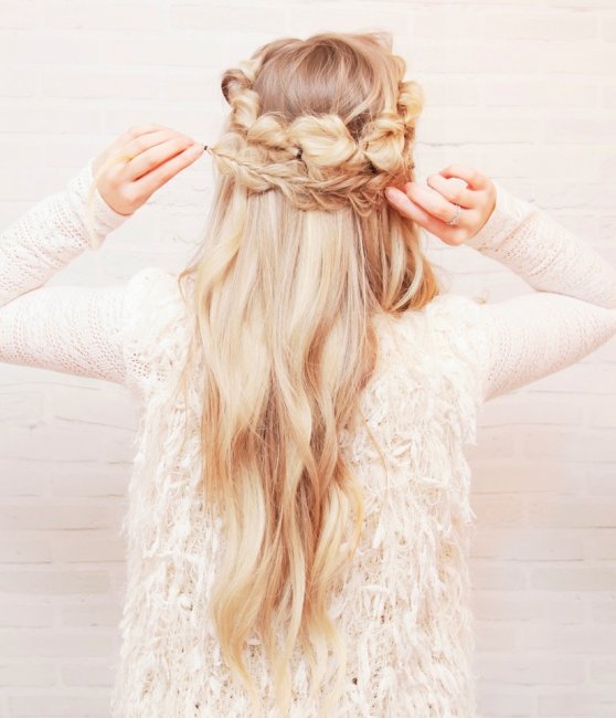 Это легкая прическа на длинные волосы на праздник. Чтобы соорудить ободок, нужно сделать горизонтальный пробор от уха до уха и начать плести косу сбоку. Французская коса должна быть с подхватами. Также есть второй вариант: волосы делят на прямой пробор и с обеих сторон заплетают косички (они должны плотно прилегать к голове). Из них формируется ободок, а концы кос можно закрепить в виде небольшого пучка.