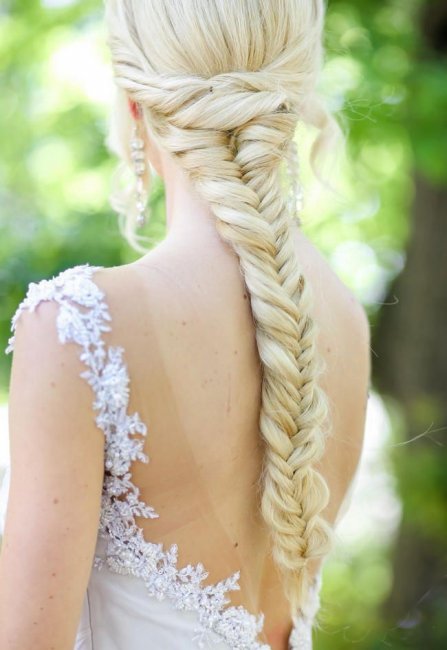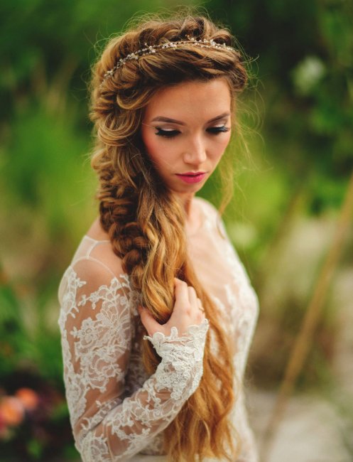 Если у вас длинные волосы, длинная объемная коса – отличный вариант для свадьбы. Существует множество элегантных способов заплести косу в день свадьбы: от классической косы «елочка» до «рыбьего хвоста», который остается в тренде уже много лет. А может быть, вам нравятся голландские косы, закрученные в эффектный ореол над головой невесты. Они придадут образу фантастичности и загадочности.
