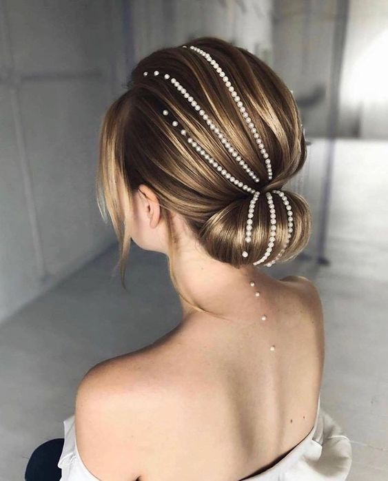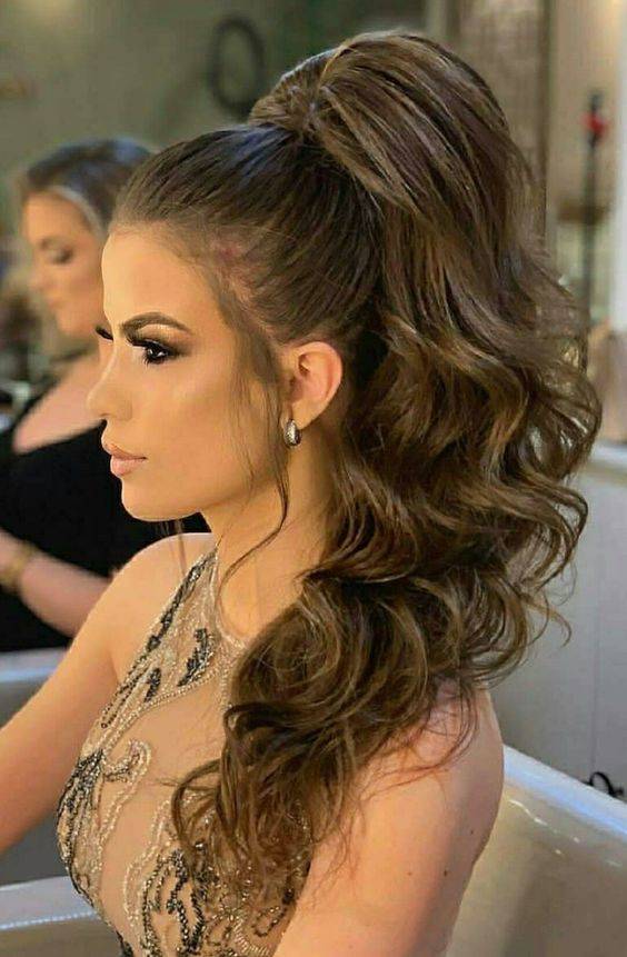 Такая укладка станет хорошим дополнением брючного костюма или платья по фигуре с оголёнными плечами. Верхнюю часть волос начёсывают, аккуратно закрепляют резинкой, а после формируют хвост из остальных локонов. Резинку прячут, обкручивая прядками. Украсить хвост можно цепочкой или жемчужной нитью.
