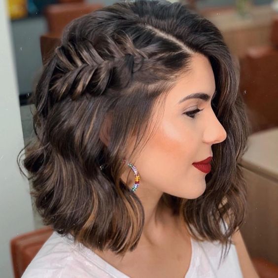 Также на каре отлично смотрится плетение из боковых прядей волос. Такой вариант универсален и подходит как для повседневного ношения, так и для праздничного выхода.