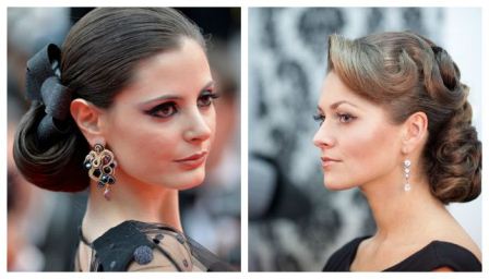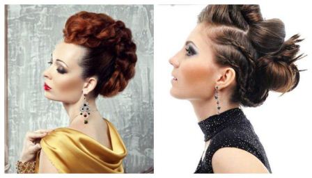Выбор той или иной прически зависит от вечернего наряда. Под длинное платье в пол хорошо смотрятся ретро-укладки с волнами, прически с объемными пучками и выпадающими на лицо прядками. Под короткое коктейльное платье выбирайте укладку на бок, плетение с низким пучком, высоких хвост с начесом и т.д.