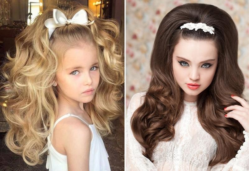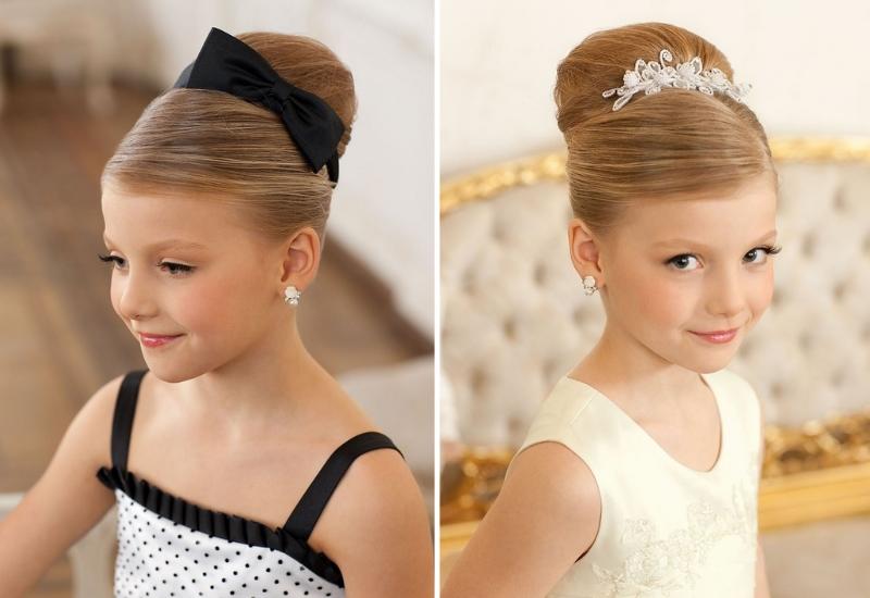 Если волосы у девочки длинные, можно красиво обыграть их и собрать пучок в виде ракушки. Для этого их подворачивают, с одной стороны, надежно фиксируют невидимками и укладочными средствами. Для дополнения образа можно выбрать заколку со стразами.