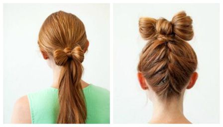 Оригинально и кокетливо выглядит бант из волос. Его можно сделать на макушке, на затылке или даже сбоку. Такая прическа не требует дополнительных аксессуаров, она и без них выглядит броско, ярко и эффектно.