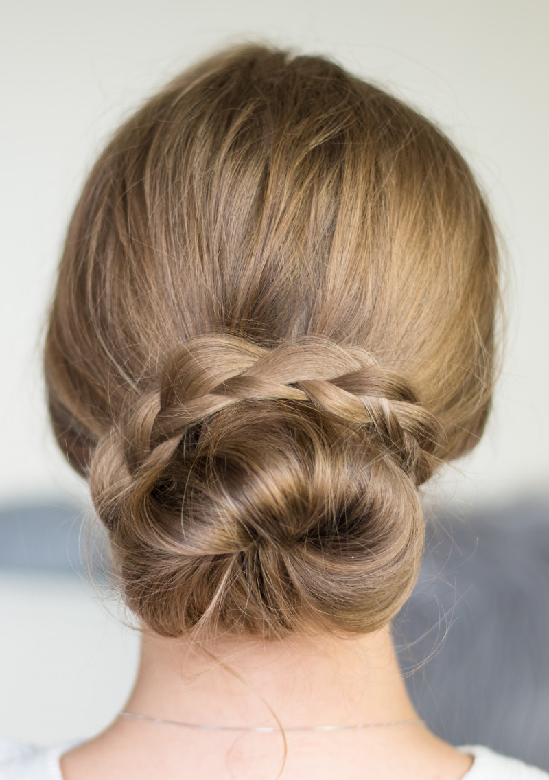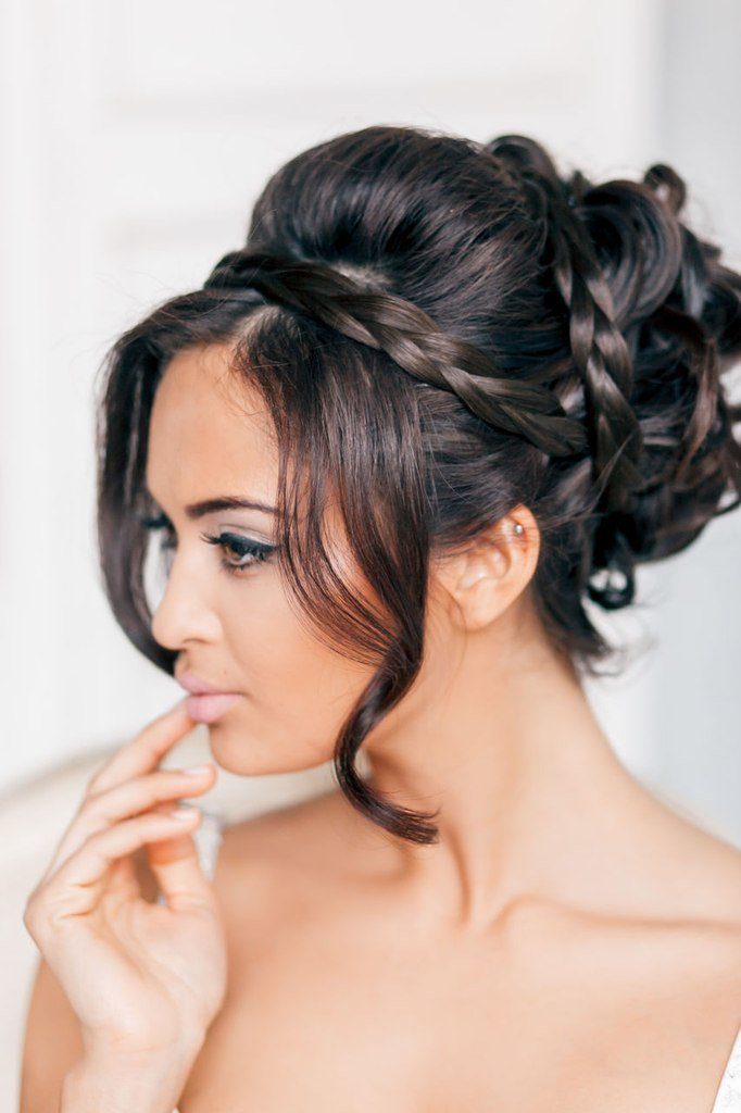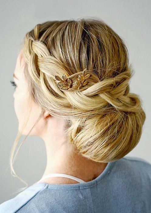 Ещё один простой способ вечерней причёски своими руками создается всего за несколько минут. Формируем из волос высокий пучок, оставив свободной небольшую прядку. Делим её на три части и заплетаем обычную косичку. Готовое «рукоделие» оборачиваем вокруг основания пучка и фиксируем невидимками.