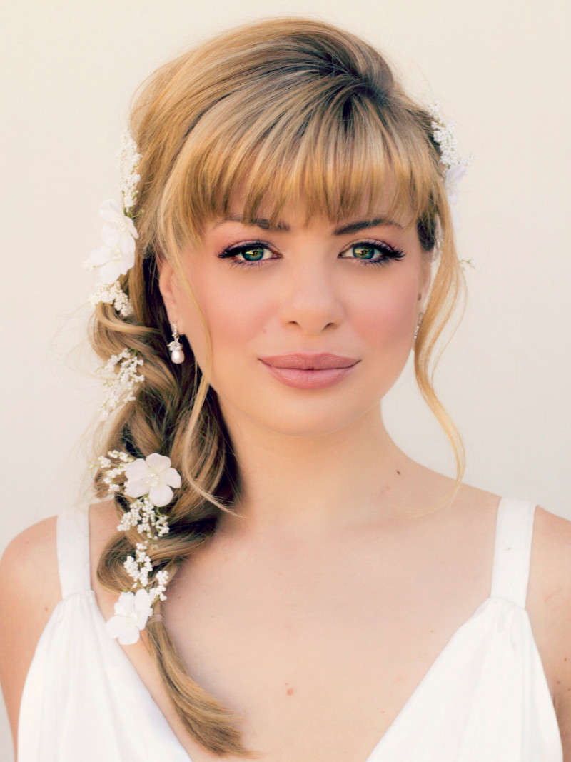 Челка при таких прическах может быть не только ровной, но еще и косой, волнистой, прямой. Но самое главное в прическе греческого стиля – добавить в челку аксессуаров. Это могут быть обручи, заколки или диадемы. Однако самый лучший вариант, который поможет приблизиться к истинной греческой красавице, это добавление мелких бутонов живых цветов.