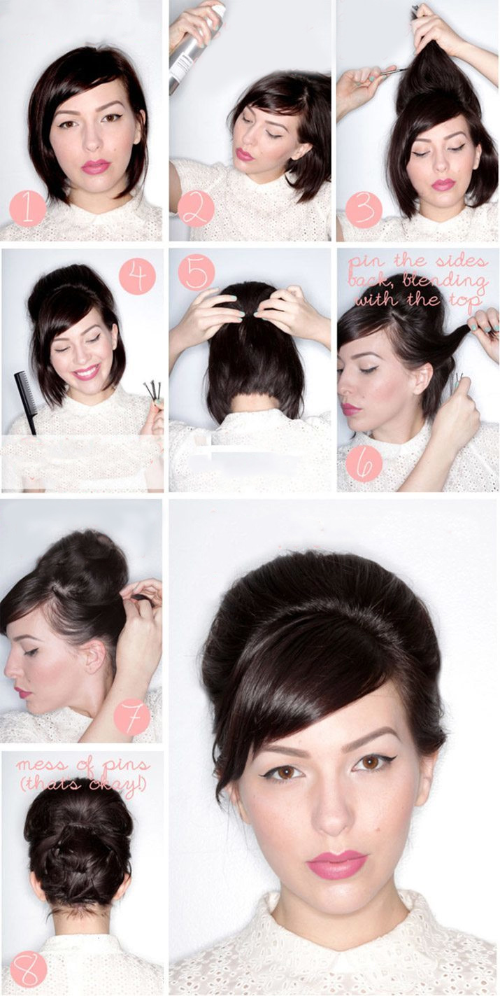 Вечерняя прическа на короткие волосы выполнена. Теперь дело только за украшением шевелюры. Можно в центр пучка прикрепить шпильку со стразами или заколку с большим цветком. Получится очень торжественная и элегантная прическа.