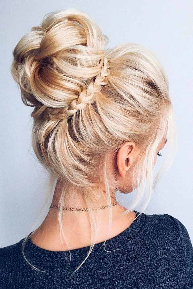 Популярность этой причёски объясняется довольно просто: пучок не требует каких-то парикмахерских навыков и подходит абсолютно любому типу внешности. Чтобы получить необычный пучок в виде бантика, необходимо собрать локоны в высокий хвост и сделать с помощью резинки небольшую петлю из волос. Далее сформировать из неё две половинки оригинального бантика, а кончик хвоста закрепить в центре невидимками.