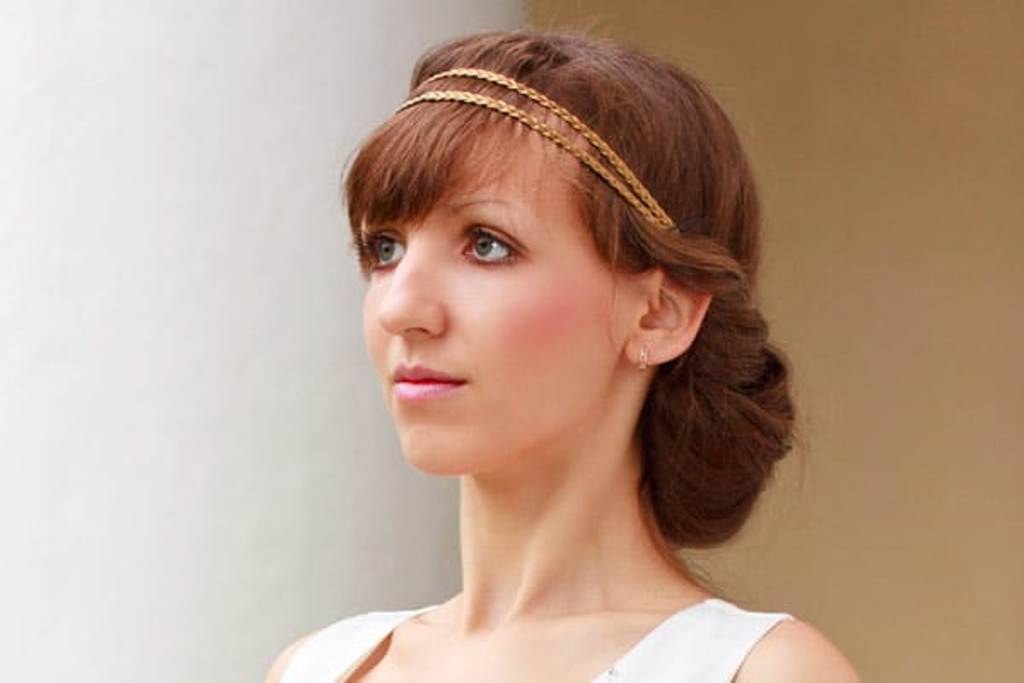 Челка при таких прическах может быть не только ровной, но еще и косой, волнистой, прямой. Но самое главное в прическе греческого стиля – добавить в челку аксессуаров. Это могут быть обручи, заколки или диадемы. Однако самый лучший вариант, который поможет приблизиться к истинной греческой красавице, это добавление мелких бутонов живых цветов.