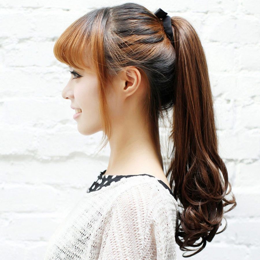 При необходимости вытянуть лицо, и добавить роста сделайте хвост с начесом. Это касается девушек, у которых густая длинная челка до бровей. Ведь она округляет форму лица. Приподнимите прикорневую макушечную зону, затем соберите локоны и затяните резинкой в цвет шевелюры.