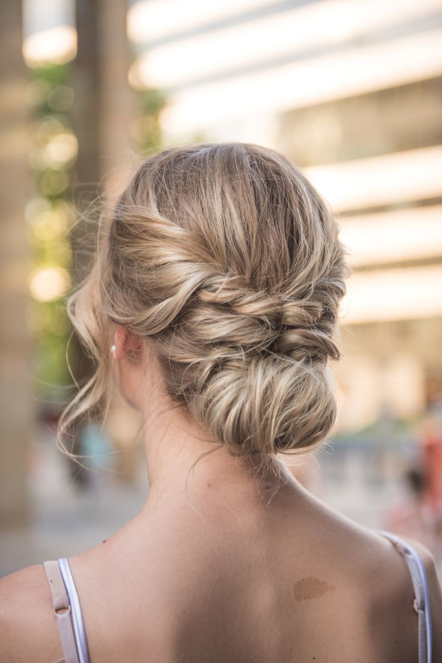 Современный твист представляет хаотично собранные на затылке волосы. При этом он демонстрирует не ровные аккуратные линии, а напротив, немного небрежную объемную форму. Укладка предусматривает пару выпущенных прядей и объемную челочную зону. Получится отличная вечерняя прическа с челкой.